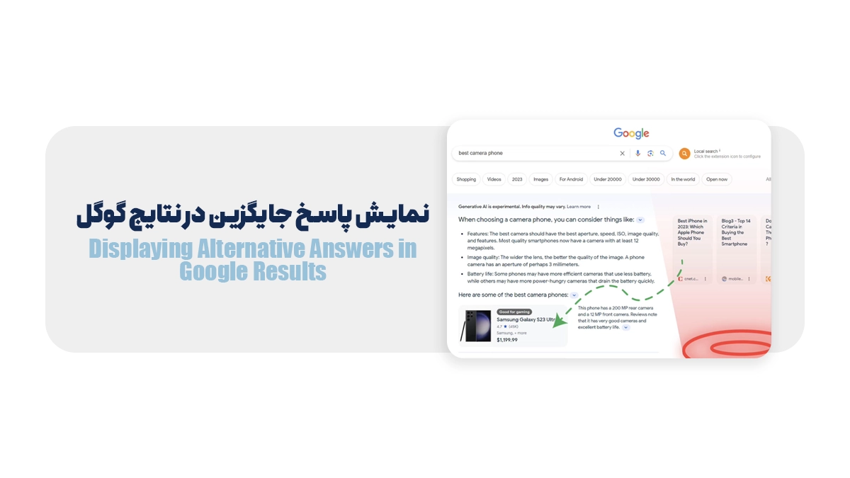 جدیدترین و جنجالیترین بخش گوگل، نتایج هوش مصنوعی یا آنچه گوگل آن را SGE (Search Generative Experience) مینامد، است. این بخش معمولاً در بالاترین قسمت صفحه نتایج و با رنگبندی متمایز ظاهر میشود.