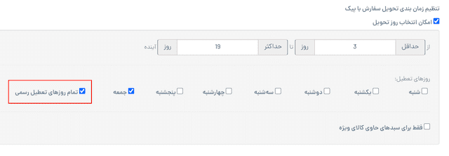 برای اضافه کردن تعطیلات رسمی به لیست روزهای غیر قابل انتخاب جهت تحویل با پیک میتوانید به تنظیمات فروشگاه» تنظیمات ارسال مراجعه کنید