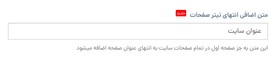 این قابلیت که به قالبهای نسل جدید اضافه شده از طریق تنظیمات طرح » اطلاعات سایت » متن افزوده شده به انتهای تیتر صفحات در دسترس است. توجه داشته باشید که این متن به عنوان صفحه اصلی اضافه نمیشود.