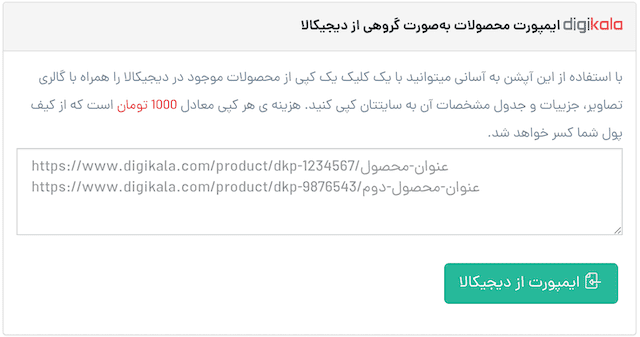 از طریق بخش محصولات » ایمپورت این قابلیت فراهم شد که بتوانید انبوهی از لیست محصولات در دیجی کالا را بصورت گروهی وارد کرده و با یک کلیک به سایت خود اضافه کنید.
