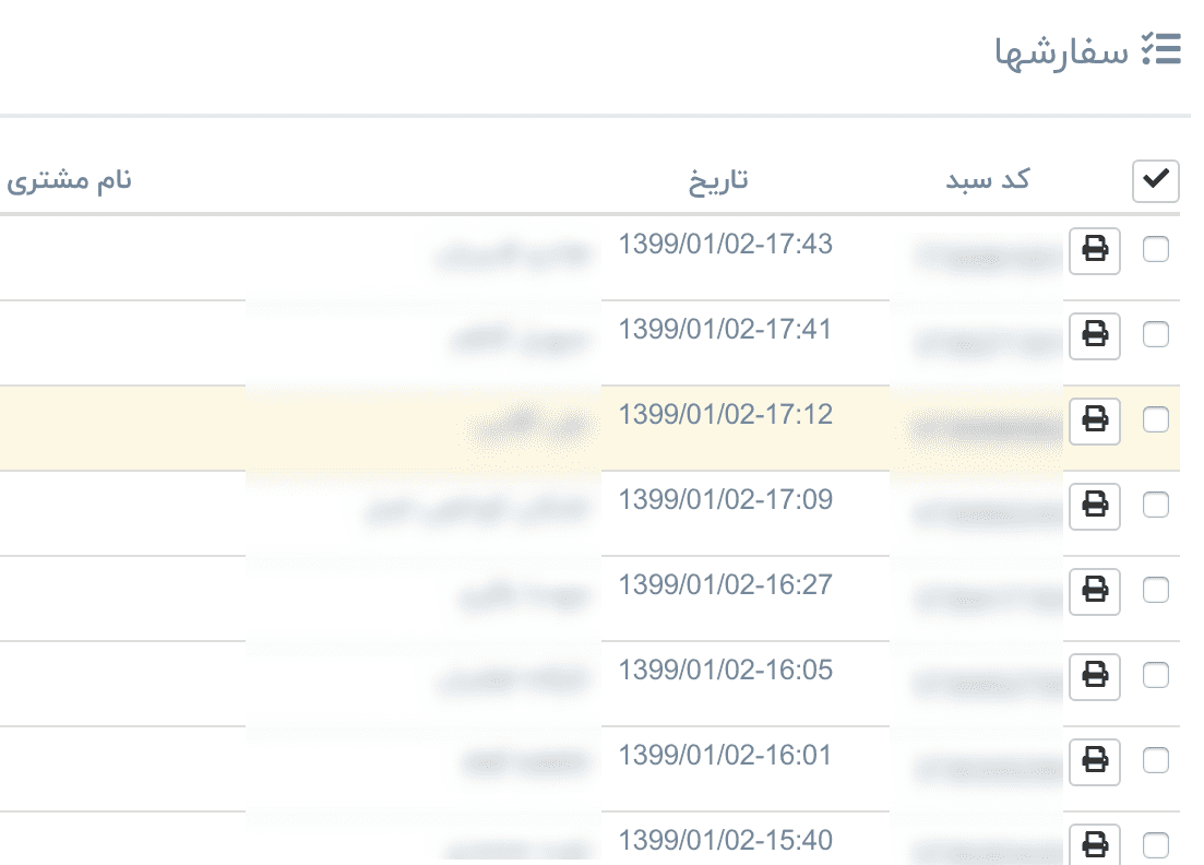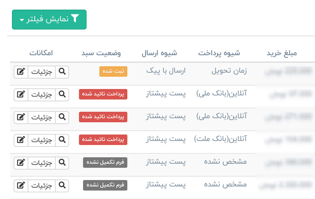 با کلیک بر روی شیوهی ارسال، شیوهی پرداخت و وضعیت در صفحه ی سفارشها فقط سبدهایی نشان داده میشوند که خصوصیت مشابهی داشته باشند