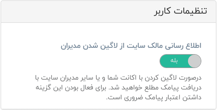 این گزینه در تنظیمات کاربر برای سایتهای برلیان به بالا در دسترس قرار گرفته است و شما را با sms از لاگین کردن اعضایی که دسترسی مدیریتی دارند مطلع میکند.