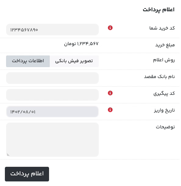از این به بعد، مشتریهایی که پرداختشون رو کارت به کارت انجام دادند، میتونند به راحتی از همین صفحه، پرداختشون رو اعلام کنند تا سفارش سریعتر تایید بشه.